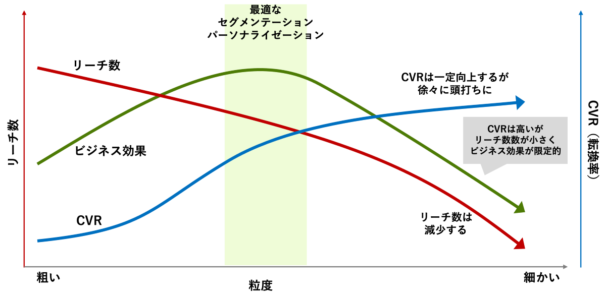 CDPやMAを使えば高度なセグメンテーションやパーソナライゼーションを実現できますが、過度に細かい施策設計はリーチ数減、コスト増に繋がり、ROIがマイナスに転じてしまいます。またパーソナライゼーションを行えばCVRは一定まで向上していきますが、徐々に頭打ちになるため、ビジネス効果の高い最適なポイントを見極めることが重要です。
