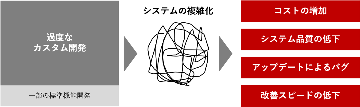注意すべきは、可能な限り標準機能で開発を完結させることです。過度なカスタム開発を行うと単純な開発コストの増加だけでなく、下記図のようなリスクが発生します。