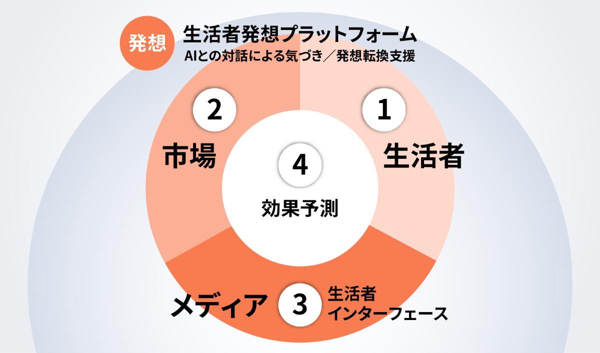- 生活者発想プラットフォームは、生活者洞察を起点にAIとの対話を通じて発想転換を促すグループ共通の技術基盤です。具体的には多様なデータソース(行動データ、定性調査、文化的コンテクスト、グループの暗黙知)を統合し、別解を生み出す発想支援のための4つの機能を提供しています。