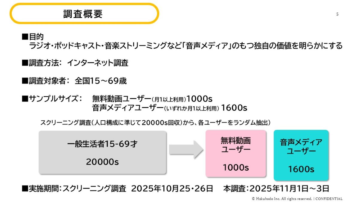 - まずはメディア環境研究所が実施した「音声メディアパワー調査 2025」の速報からご紹介させてください。対象者は全国15歳から69歳の方々で、1.音声メディアの力、映像にはない音声ならではの魅力は何か、2.喋りを中心としたスポークンメディアと音楽ストリーミングそれぞれの魅力は何か、そして3.ラジオやポッドキャストなど個別サービスの魅力は何か、という視点で2万人にスクリーニング調査を行いました。