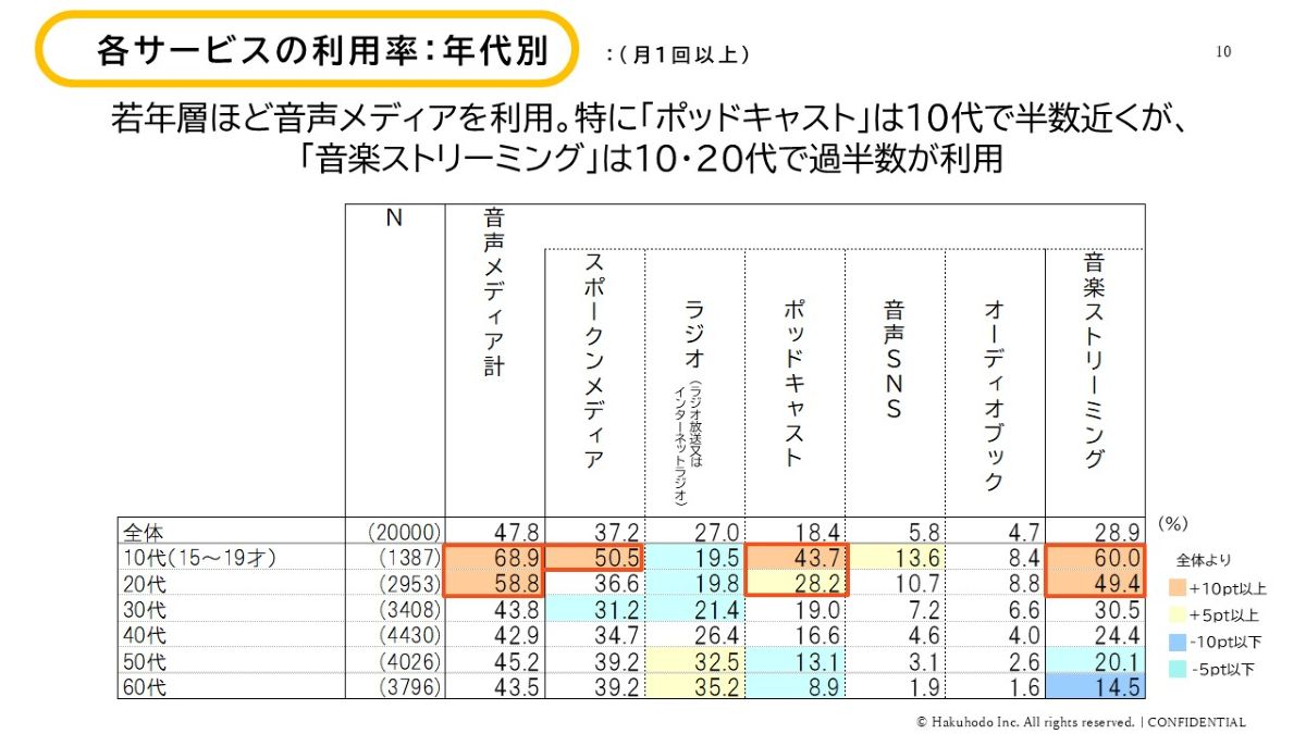 特にスポークンメディアを聞く人が4割弱、そのうちラジオは27%、ポッドキャストは18.4%でした。音楽ストリーミングは約3割弱です。年代では、10代、20代の音声メディア利用率が高く、音声メディア合計では10代の7割、20代は6割が利用しています。スポークンメディアは10代の半数が聴いていて、ポッドキャストは4割を超え、若年層によく聴かれていることがわかります。