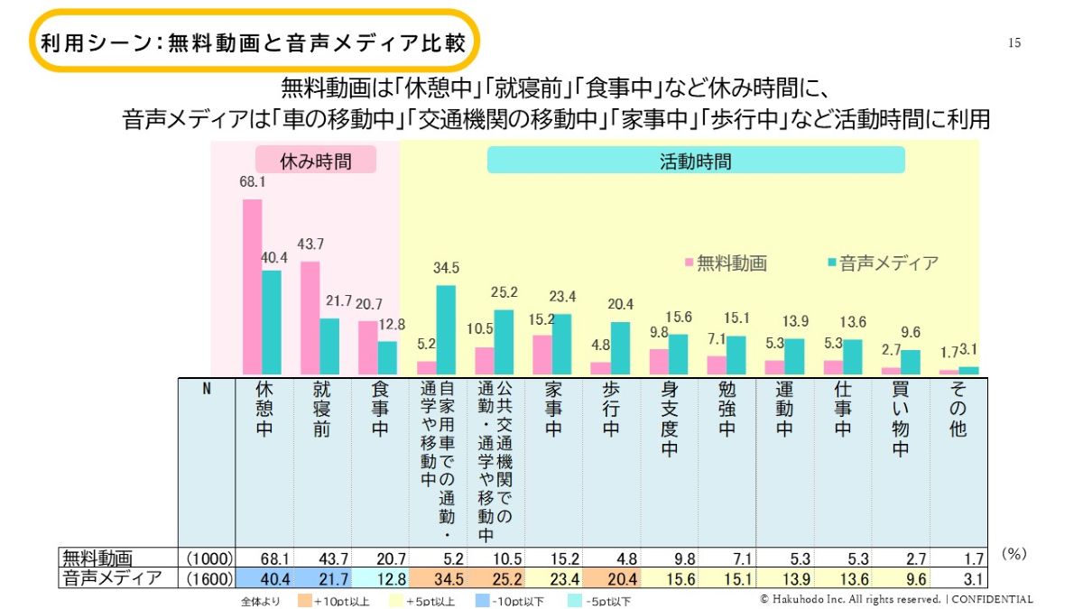 無料動画は休憩中、就寝前、食事中の利用が多い一方、音声メディアは、自家用車や交通機関での通勤・移動中、家事中、歩行中、身支度中など、生活のあらゆるシーンで何らかの行動をしながら“ながら聞き”されていることが見て取れました。さらに利用時間帯を見てみると、音声メディアは無料動画よりも朝に優位に使われる朝型メディアと言えそうです。