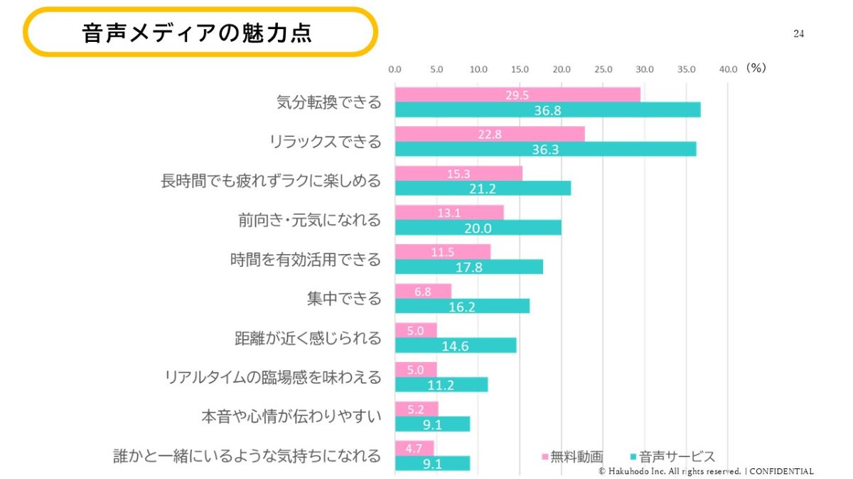 音声メディアと無料動画を比較したところ、繰り返し楽しめて、目的や気分に応じて選べるという点や、何かをしながら効率的に情報や知識を得られたり、ここでしか聞けない人や内容のコンテンツがあるという点は共通の魅力です。無料動画が音声メディアに比べて高かった項目は、暇をつぶせるし、短時間でサクッと楽しめるという点。ダラダラでもサクッとでもどんなモードでも自由に楽しめるのがポイントです。さらに、知りたいことが詳しく、かつ直感的に分かりやすいのも魅力とされました。一方、音声メディアが無料動画より高かった項目は、まず気分転換やリラックス、長時間でも疲れず楽しめるといった点です。また、時間を有効活用できて集中できるという、日々の行動をはかどらせてくれるところもポイントです。また、距離が近く感じられたり、リアルタイムの臨場感、本音や心情がきちんと伝わって、誰かと一緒にいるような、近くで深くつながるというイメージも強いようです。