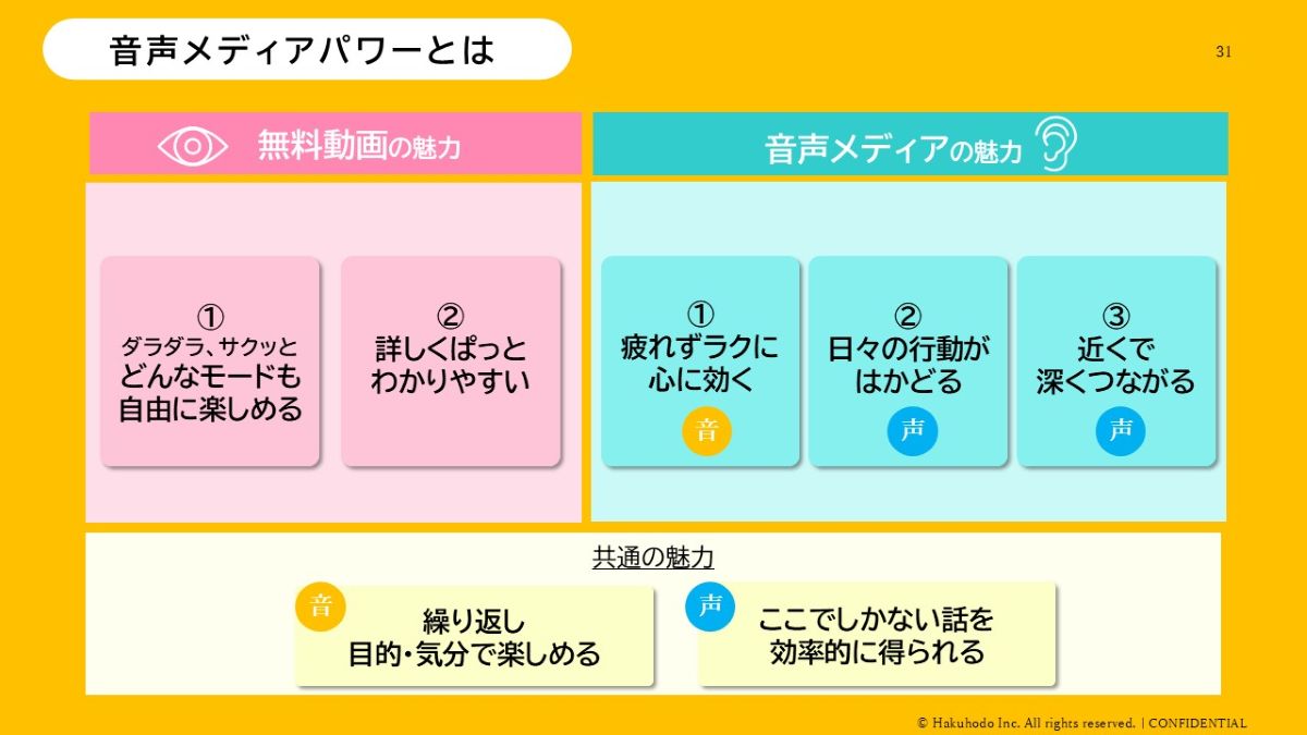 このように無料動画の魅力とは、どんなモードでも楽しめわかりやすいこと。そして音声メディアの魅力は、楽ではかどり、深くつながることができるということになります。