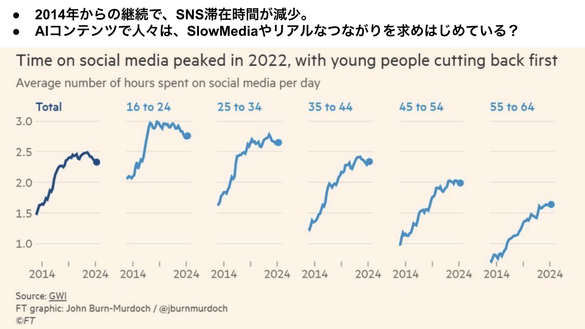 ではまず、ポッドキャスト関連動向を見てみます。GWIという調査会社が2014年から行っていた世界中のSNS の利用状況調査によると、2022年をピークに減少しており特に若年層が低下しています。AIコンテンツに人々が疲れてしまい、じっくり視聴するスローメディアやリアルなつながりを求め始めているのではないかと解釈できます。
