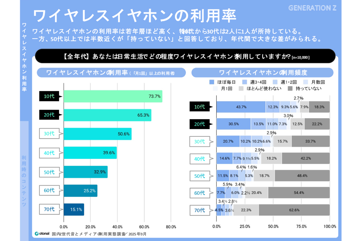 私たちの行った調査からユーザーの職業比較を見てみると、経営者やマネージャーなどのビジネス層と学生という、両極端な層にユーザーが多いことがわかっています。 市場全体の成長の背景には、ハードウェアとしてのワイヤレスイヤホンの普及があります。2025年6月の調査では、ワイヤレスイヤホンの利用率は10代が73.7%、20代は65.3%で、若者ほどガッツリ使っていることがわかりました。