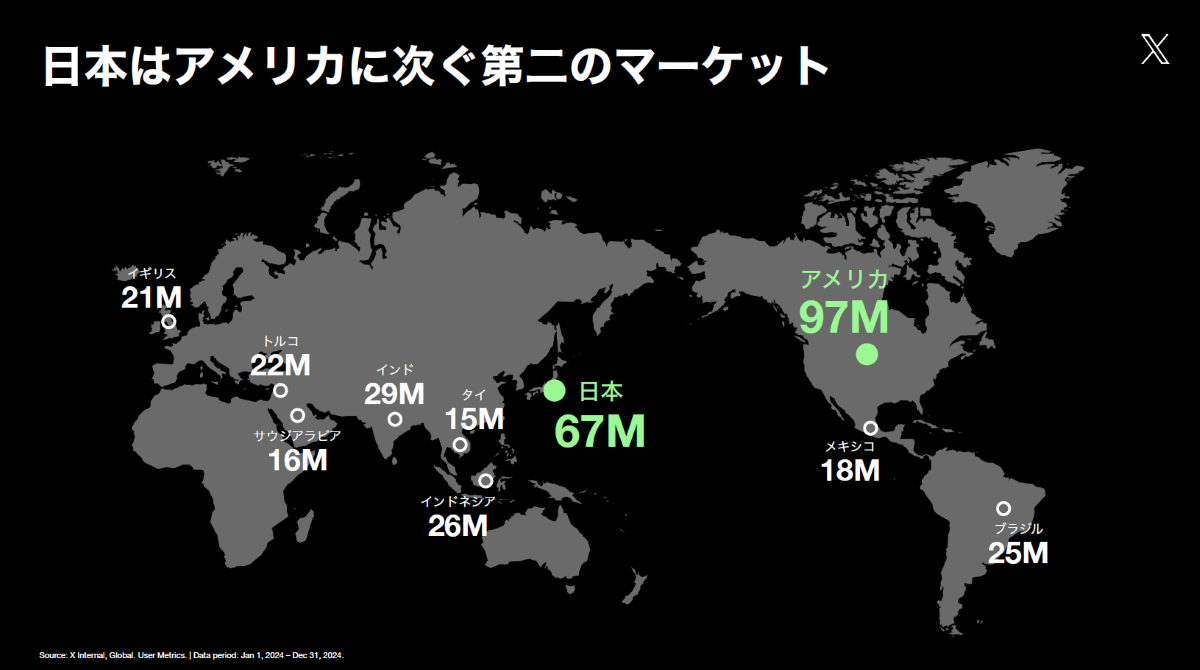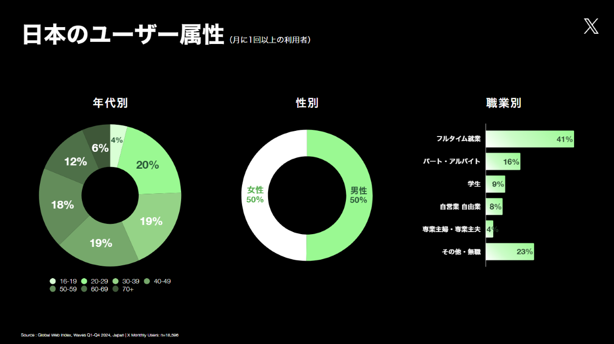 - 一般的に、Xのユーザーは若い人しかいないんじゃないか、逆に若い人は使っていないんじゃないかといったさまざまなイメージを持たれるのですが、実際は年齢も人口比例に等しいですし、性別も男女同数くらい。偏ることなくあらゆるところにユーザーさんがいるんですよね。