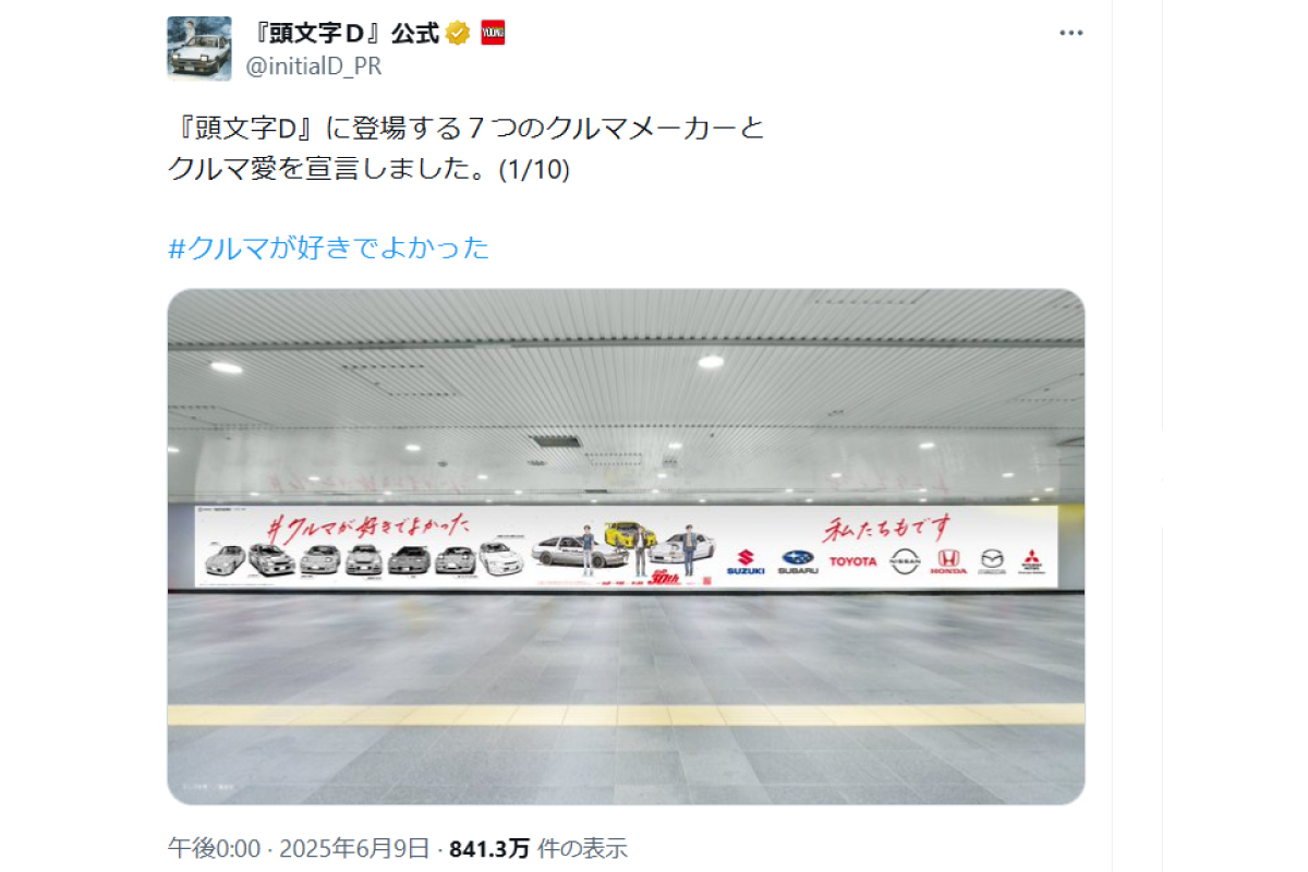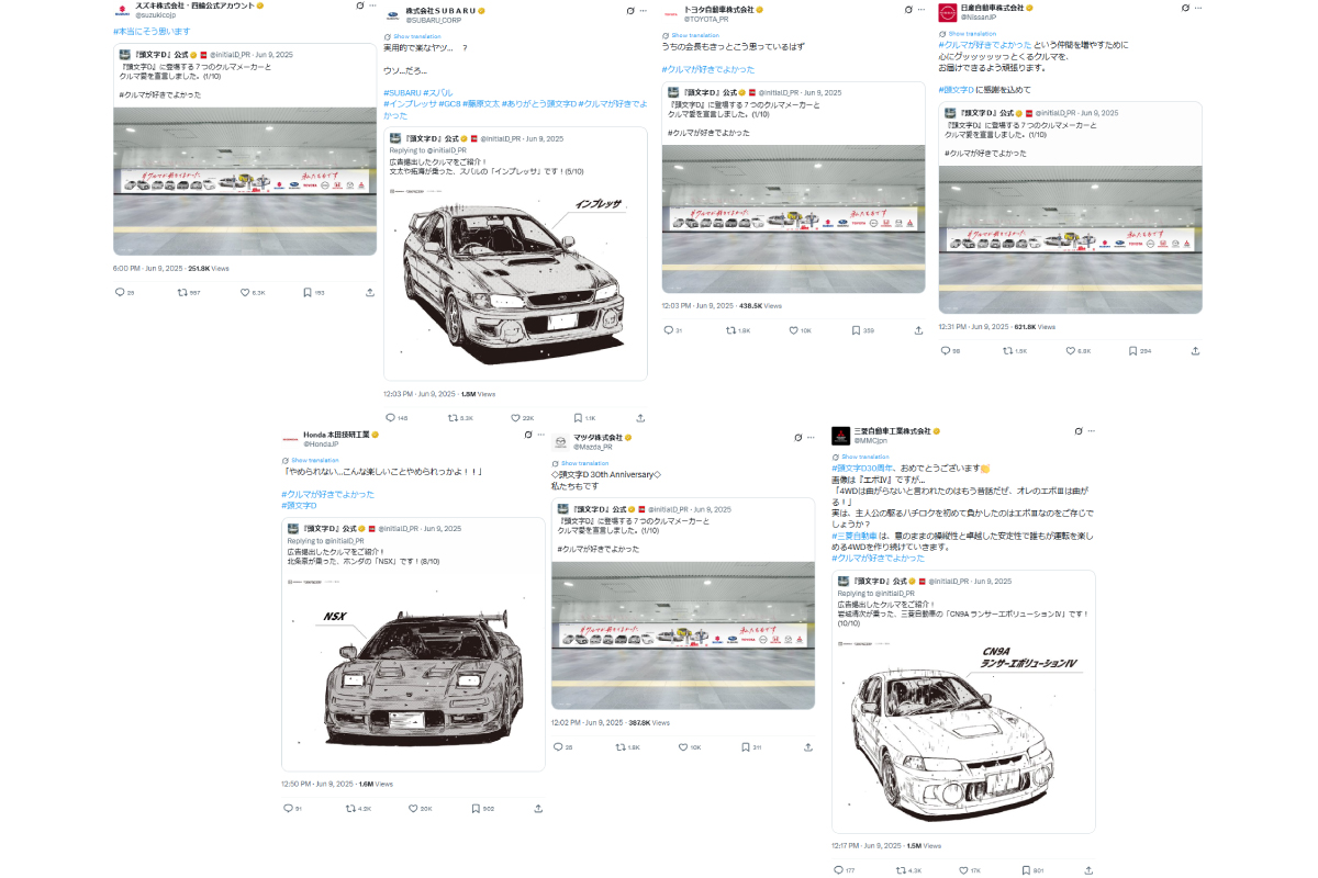 さらに、『頭文字D』公式のX投稿が7つのクルマメーカーそれぞれの思いを乗せて拡散されて、部品メーカーや中古車ディーラー、車情報誌など、クルマ業界全体にまで賛同が広がりました。