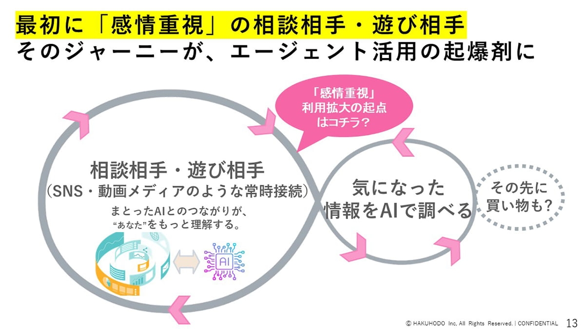 調査データは、生活者がAIを単なる効率化ツールではなく、感情的なパートナーとして見始めていることを示している。20%は「AIが寄り添ってくれる」と認識し、28%は「人間よりもAIを信頼して相談している」。さらに10代の28%は「AIに恋人になってほしい」と回答している。森は「AIは『便利さ』を超えてパートナーになるべき」だと強調する。