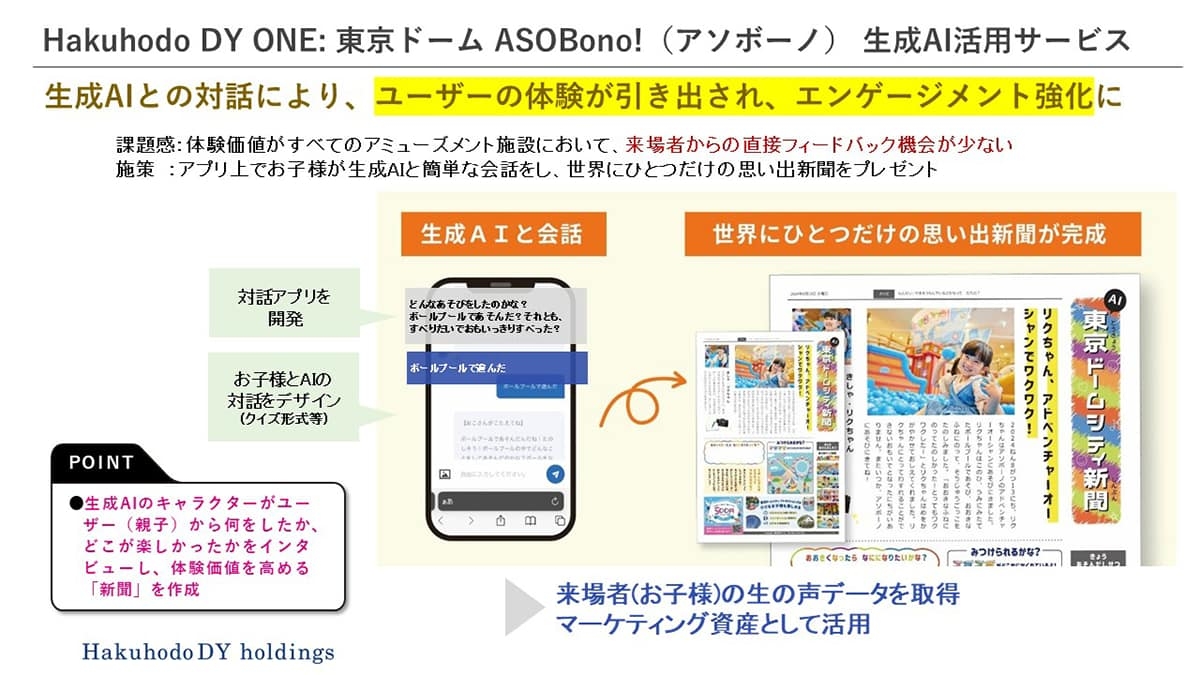 その具体例として、東京ドームシティ内のアミューズメント施設「ASOBono!(アソボーノ)」での取り組みが紹介された。同施設では、来場した子供たちの生の声を収集することが困難という課題を抱えていた。そこで、子どもが生成AIキャラクターと対話し、その内容と写真から「世界にひとつだけの思い出新聞」を作成するアプリを開発。これにより、子どもたちは楽しみながら自身の体験を言語化し、施設側はこれまで得られなかった貴重なVOC(顧客の声)をマーケティング資産として活用できるようになった。体験価値とエンゲージメントを高めながら、生活者と企業の距離を縮める好例である。