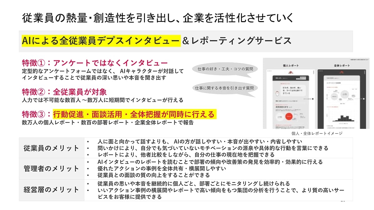 「共創」の思想は、消費者との関係構築だけでなく、従業員エンゲージメントの向上にも応用されている。従業員インタビュープログラム「ボボットウ」は、AIキャラクターが従業員一人ひとりにインタビューし、仕事へのこだわりや本音、熱量を引き出すサービスだ。これにより、従業員は内省を深め、マネジメント層はアンケートでは得られない定性的なインサイトを把握できる。働き手としての生活者と企業とをつなぐ試みである。