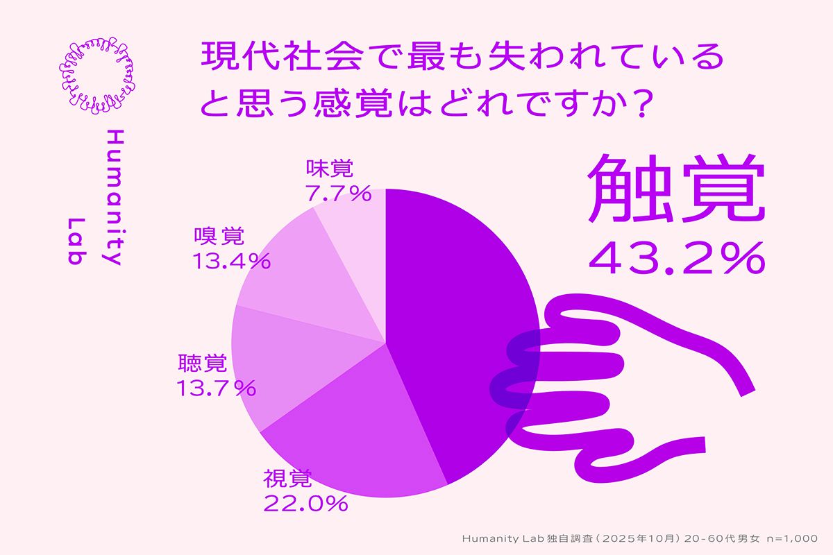 その中で、「デジタル化が行き過ぎて、人間として大事な感覚・感性が失われている」と思っている人が4割にのぼることが明らかになりました。さらに「現代社会で最も失われていると思う感覚」は何だと思うか訊ねたところ「触覚」と答える人が43%と最も多かったんです。